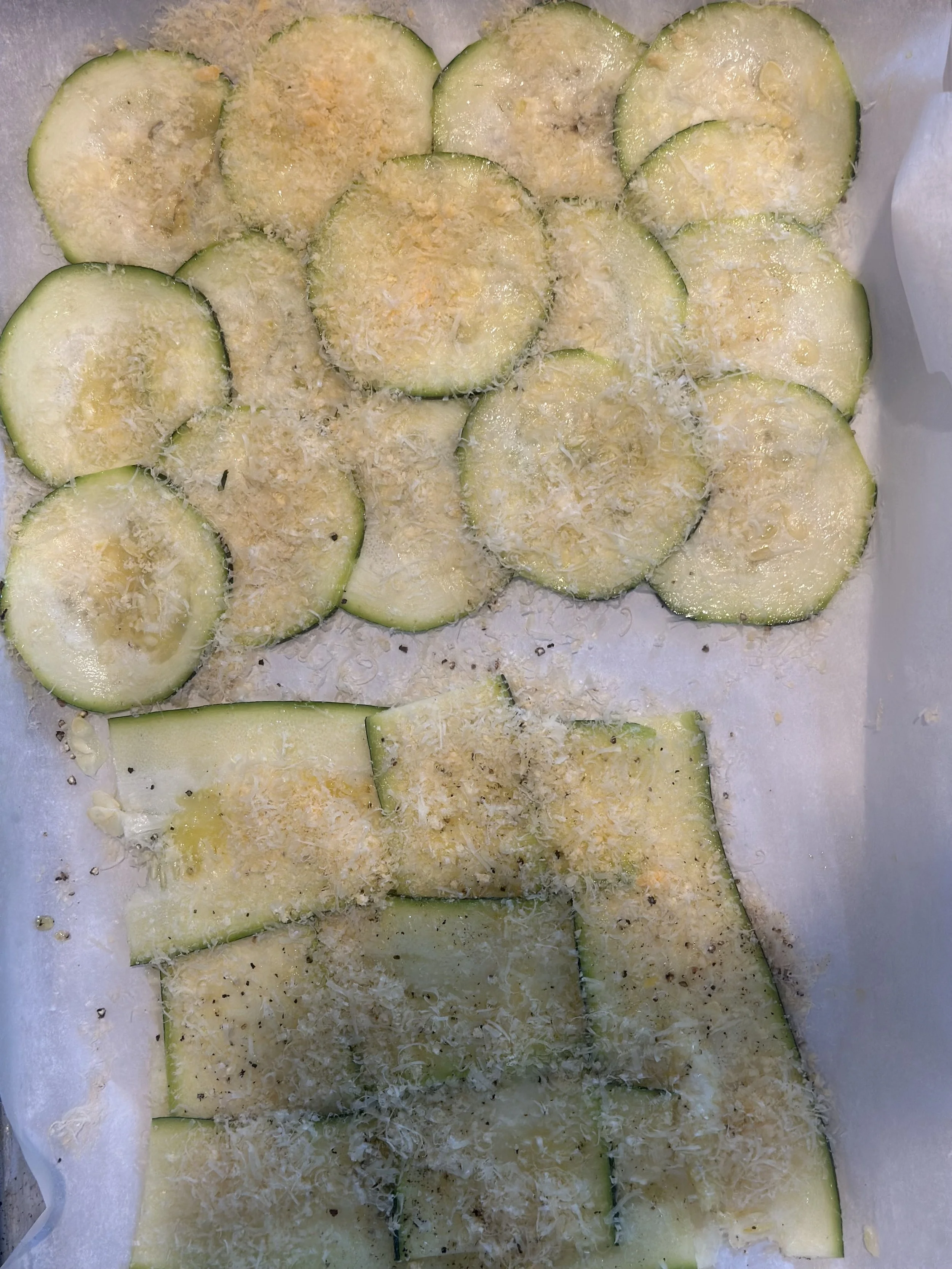 I decided to try slicing this baby two different ways - lengthwise and in coins. I was curious to see which way would hold food / it’s shape better. Zucchini is tricky though - there’s such a high water content that you have to let it dry out before you start roasting it - otherwise it turns into a goopy mess. So I cut it in half and then mandolined both options and put them on paper towels for about an hour - then I pressed them on both sides to get any additional water out.