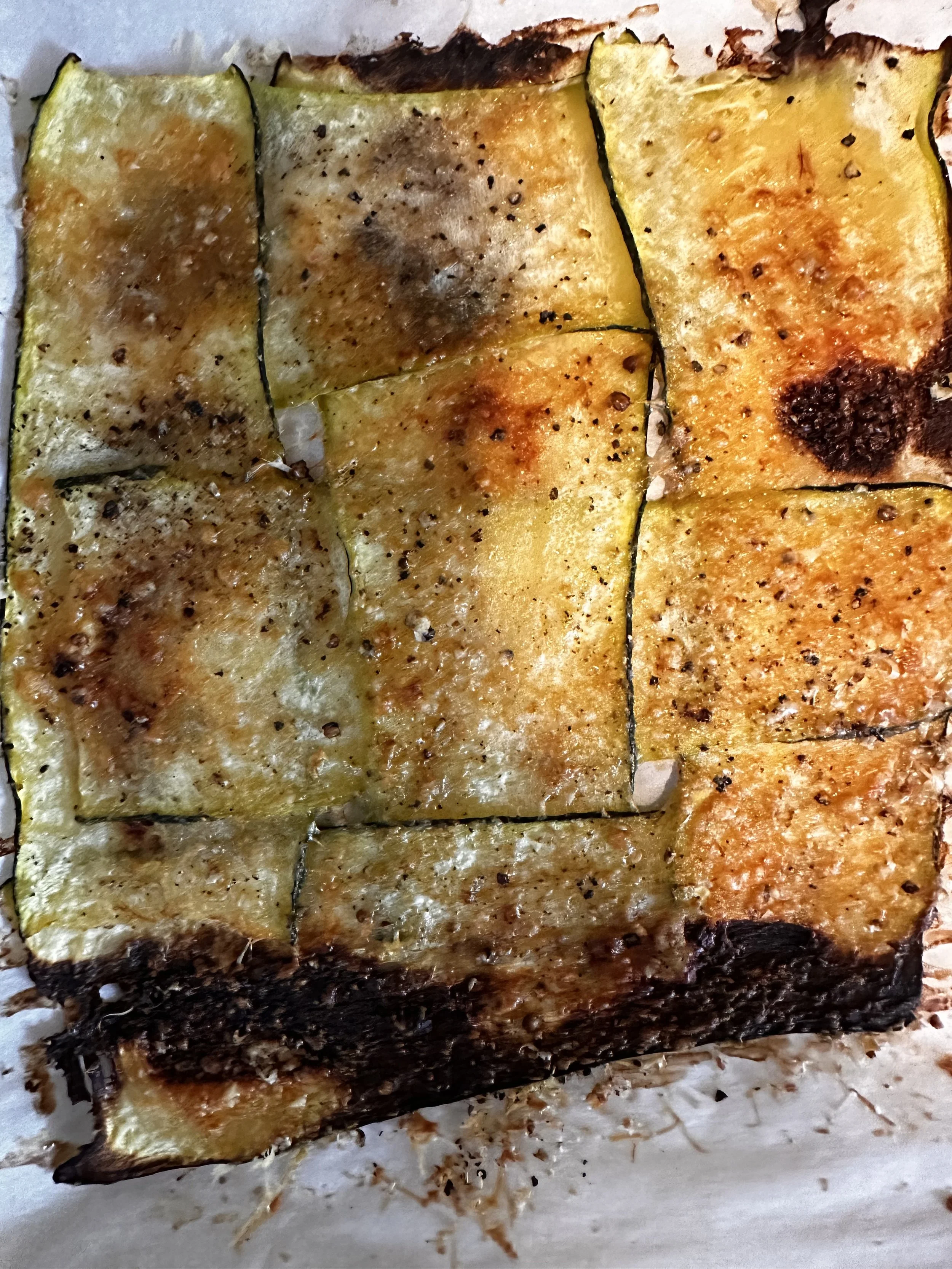 I loved the gouda paninis we made yesterday and I had a little Gouda in my fridge so I used my microplane and grated what i had. Sprinkled parchment paper with some of the grated gouda and then layered the zucchini on it and then sprinkled more gouda on top. Then I brushed it with olive oil and salt & peppered the “slices” that you see below. I made kind of a basket weave with the vertical zucchini.